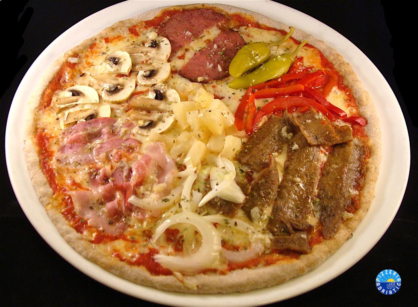 tomatsås, ost, champinjoner, lök, paprika, feferoni, kebabkött, bacon, salami, ananas, vitlök